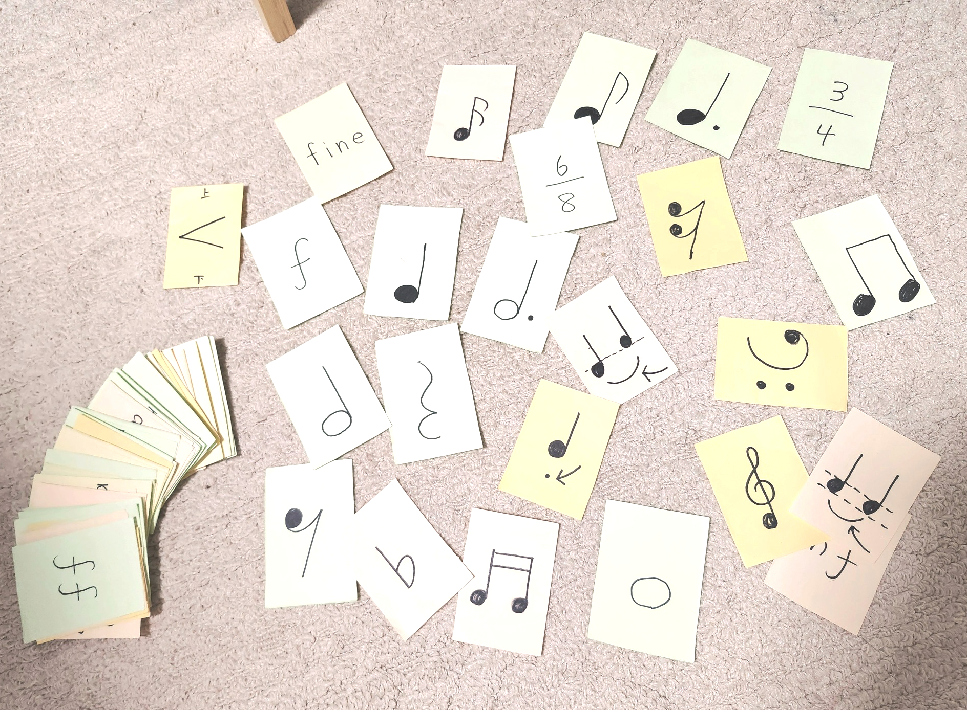 クリスマス会などの行事やワークショップでは、ピアノ以外の音楽にも楽しく触れながら、自然と興味を広げていきます。写真の音楽かるたなども活用し、遊びの中で知識を身につけていきます。